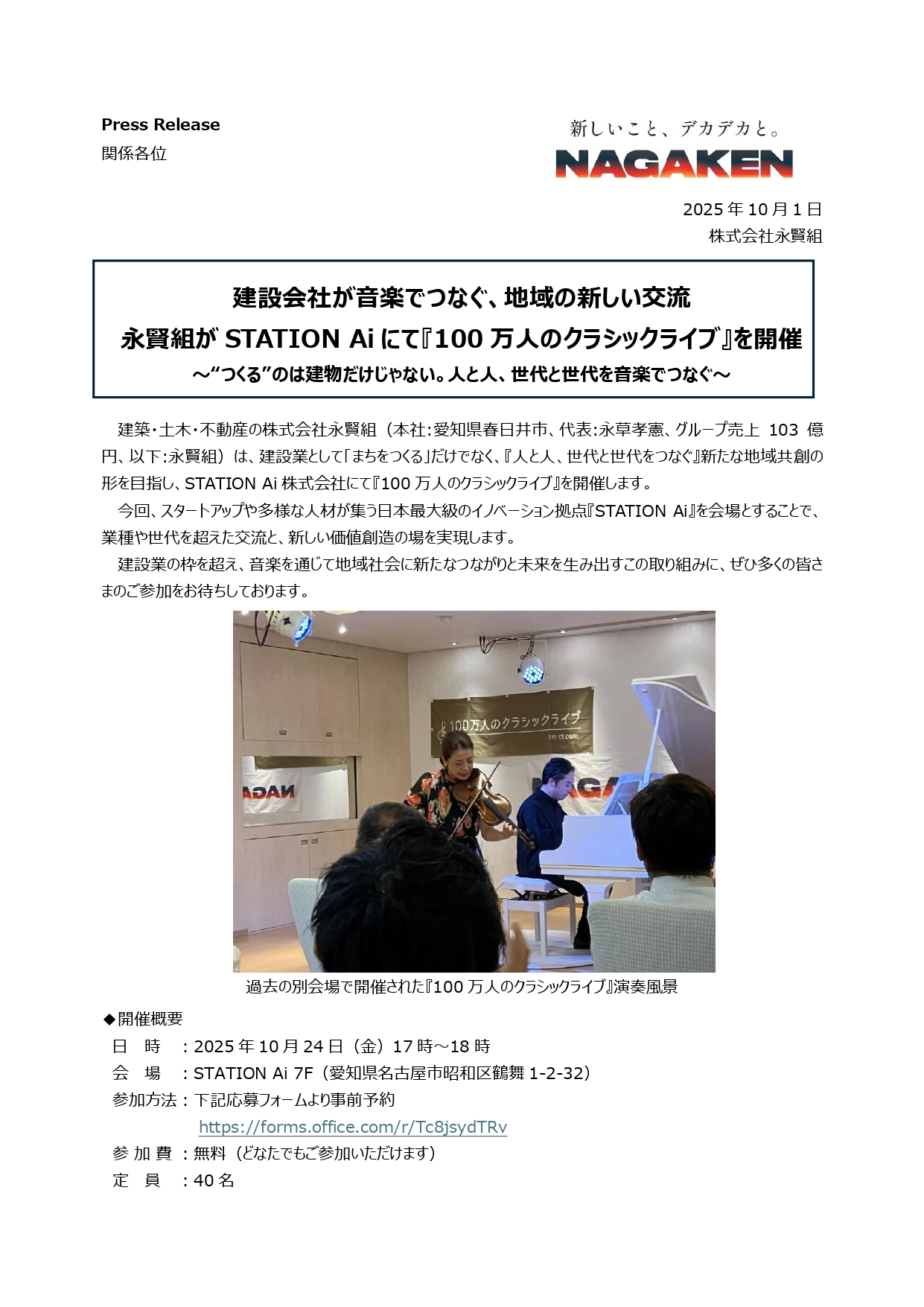 2025年10月24日(金)、STATION Ai株式会社にて『100万人のクラシックライブ』を開催いたします。