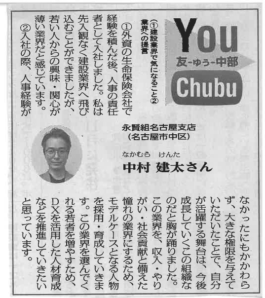 2025年10月16日(木)発行の建通新聞「友ーゆうー中部」にて、弊社 人材開発部の中村建太が紹介されました。