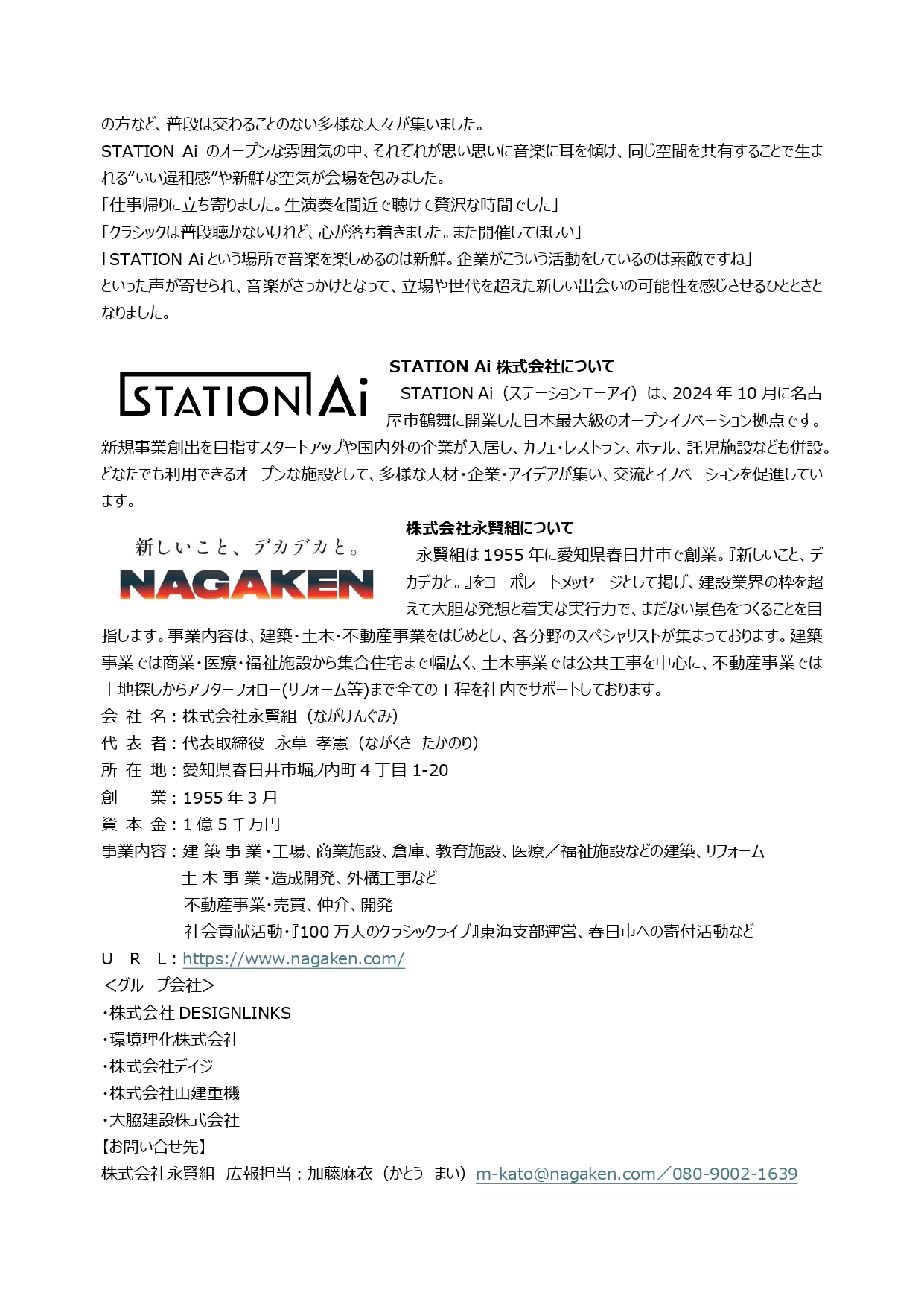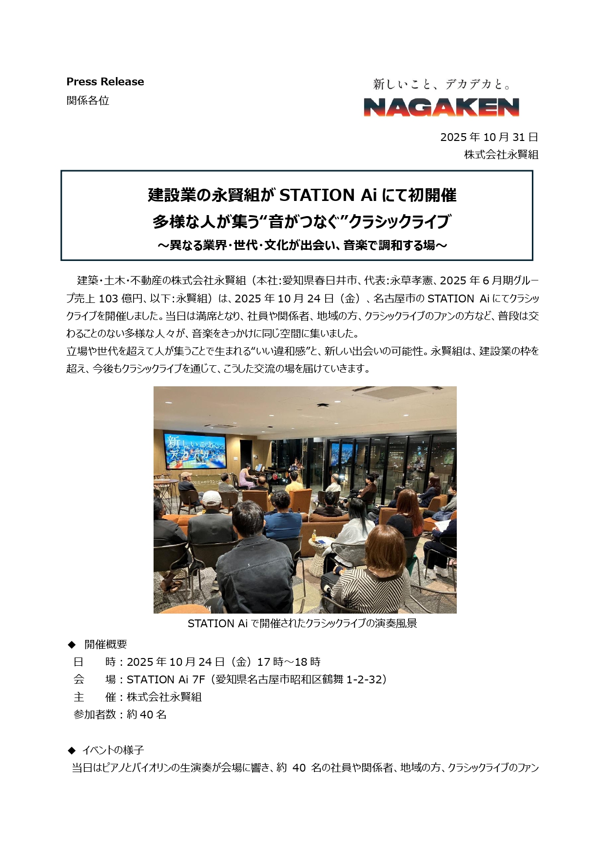 『建設業の永賢組が STATION Ai にて初開催 多様な人が集う”音がつなぐ”クラシックライブ ~異なる業界・世代・文化が出会い、音楽で調和する場~』を公開いたしました。