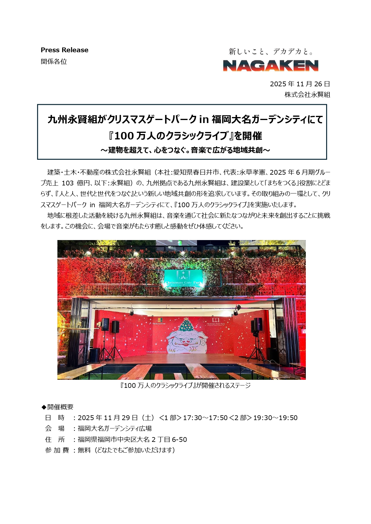 『九州永賢組がクリスマスゲートパーク in 福岡大名ガーデンシティにて 『100万人のクラシックライブ』を開催 ~建物を超えて、心をつなぐ。音楽で広がる地域共創~』 を公開いたしました。