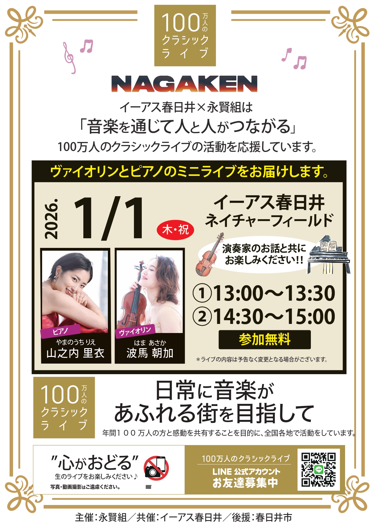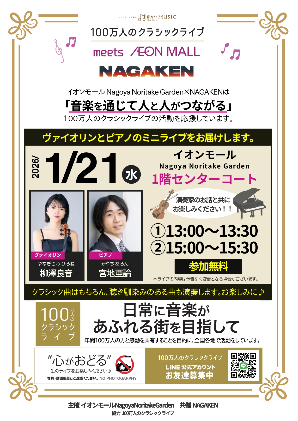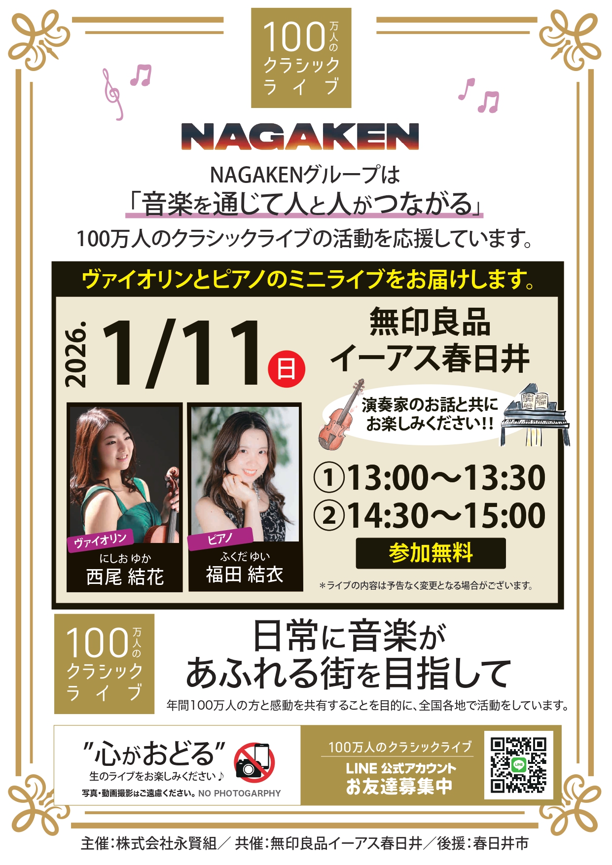 NAGAKENが開催する「100万人のクラシックライブ」1月の予定です。間近で生の演奏をお楽しみいただけます。皆様是非ご来場下さい。