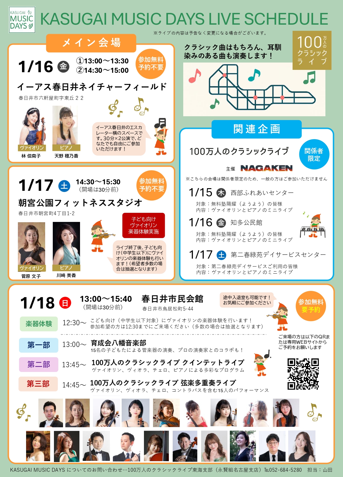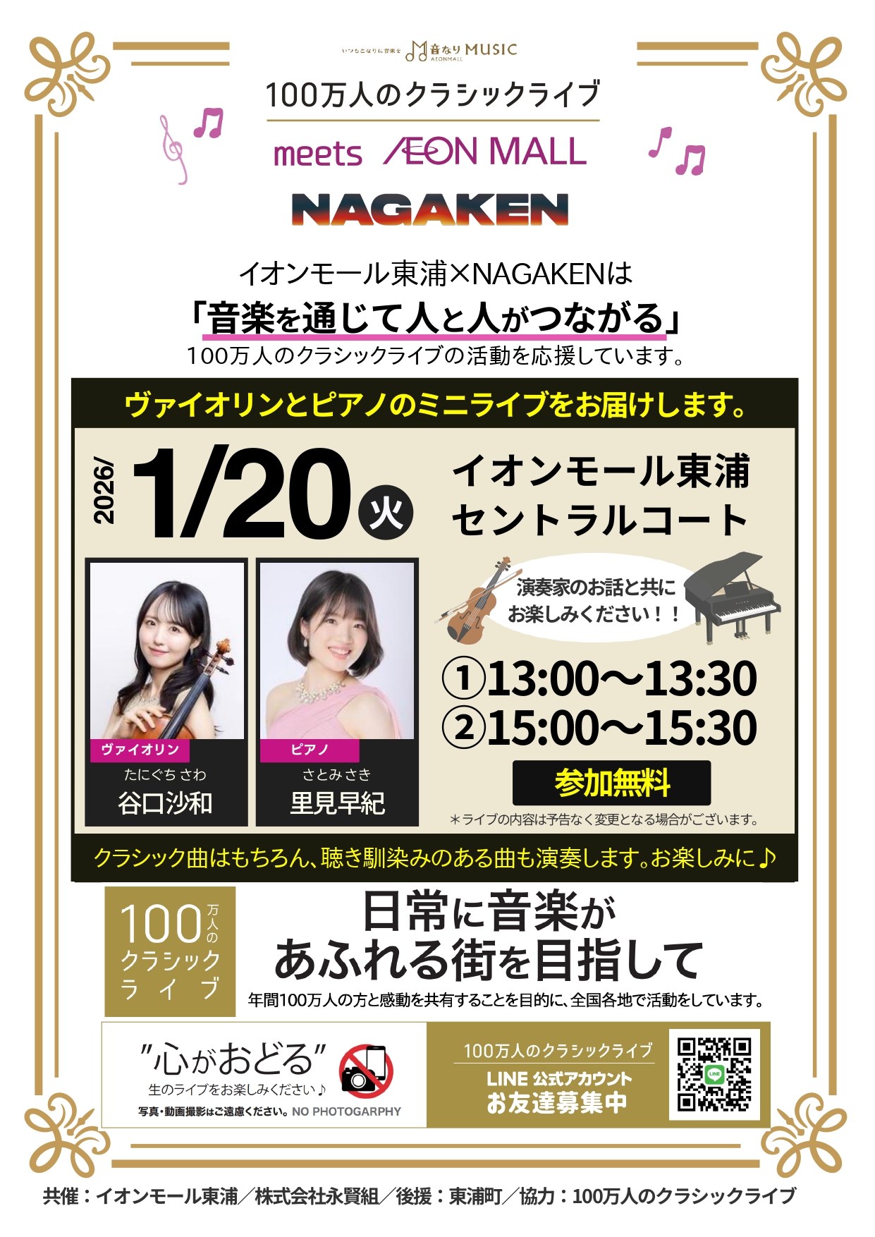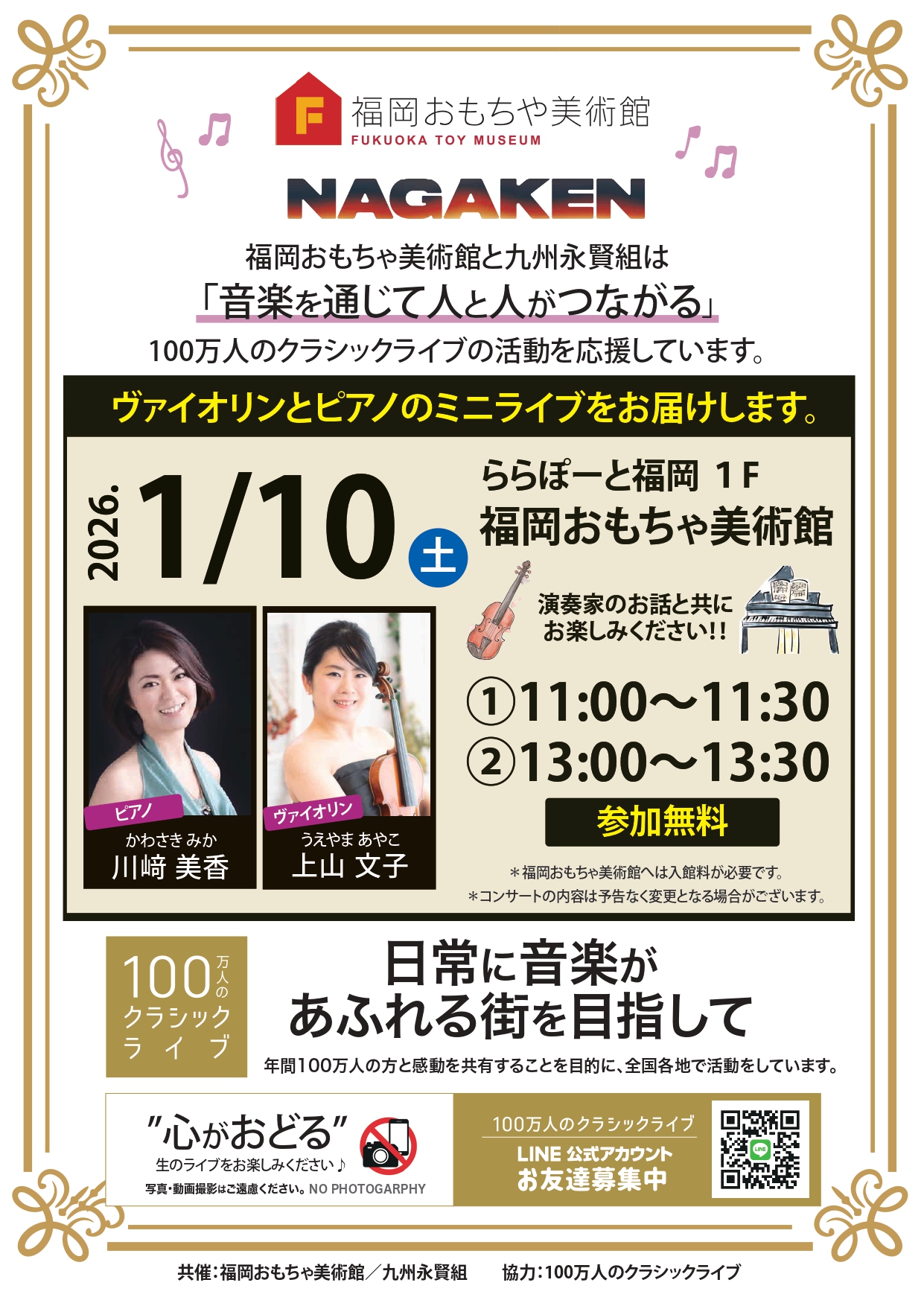 NAGAKENが開催する「100万人のクラシックライブ」1月の予定です。間近で生の演奏をお楽しみいただけます。皆様是非ご来場下さい。