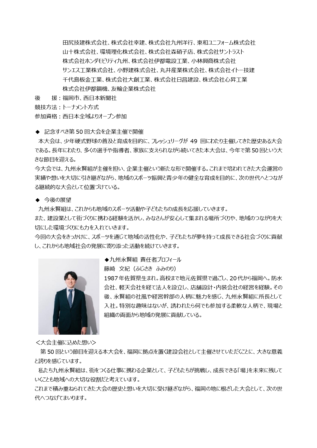 『九州永賢組が主催2026年春、 NAGAKEN CUP第50回 少年硬式野球福岡大会を開催 ~フレッシュリーグ49回の歴史を継ぎ、初の企業主催へ~』 を公開いたしました。