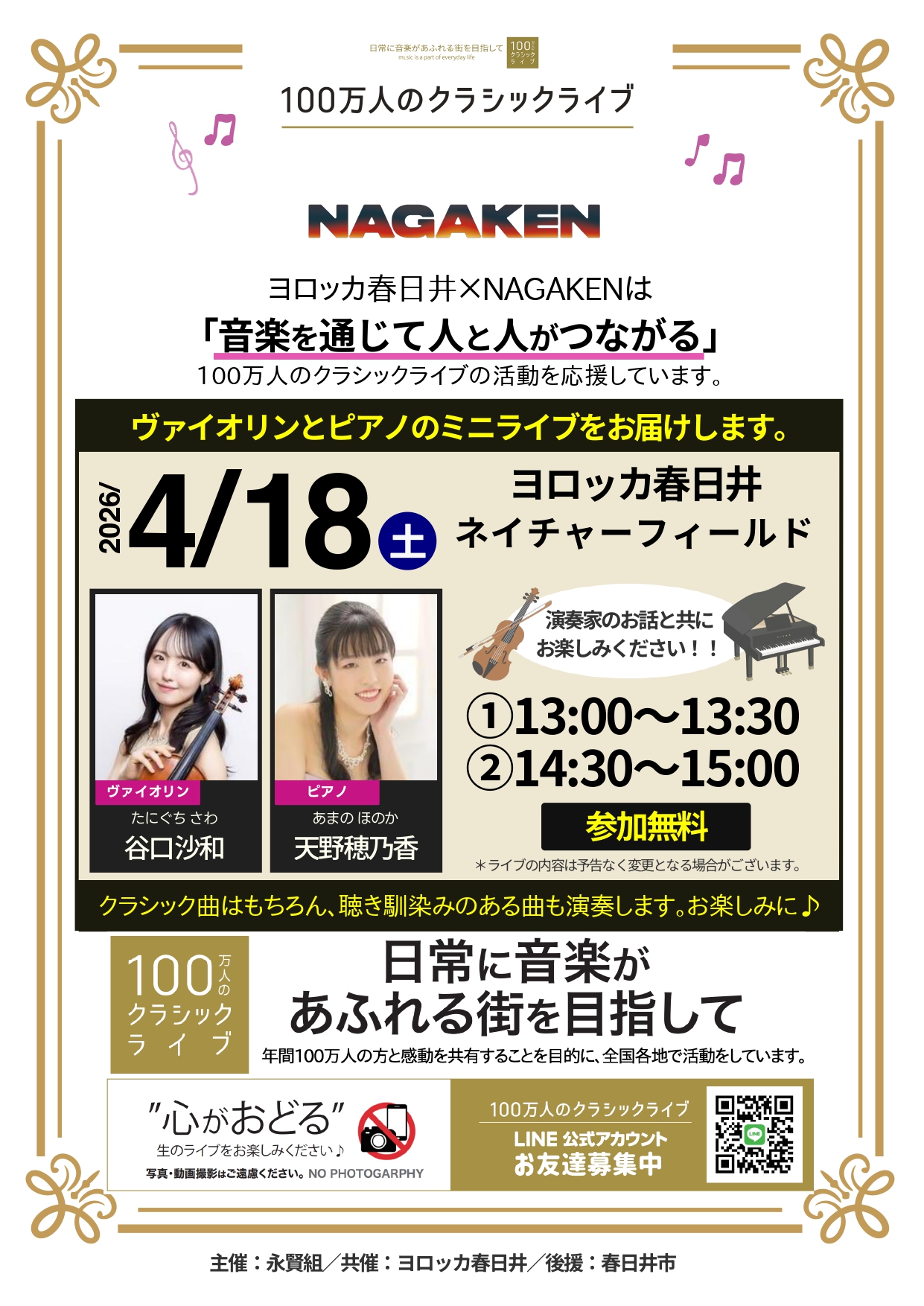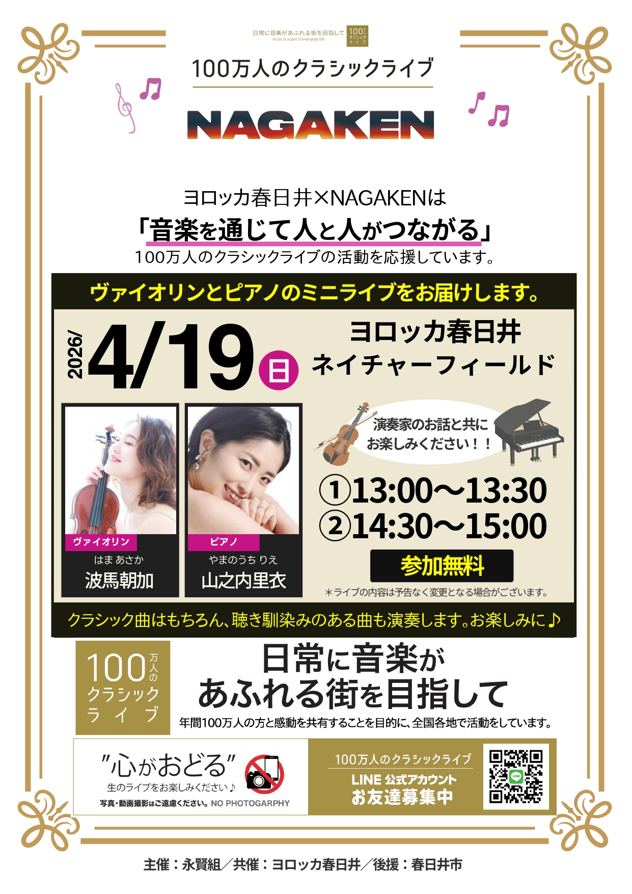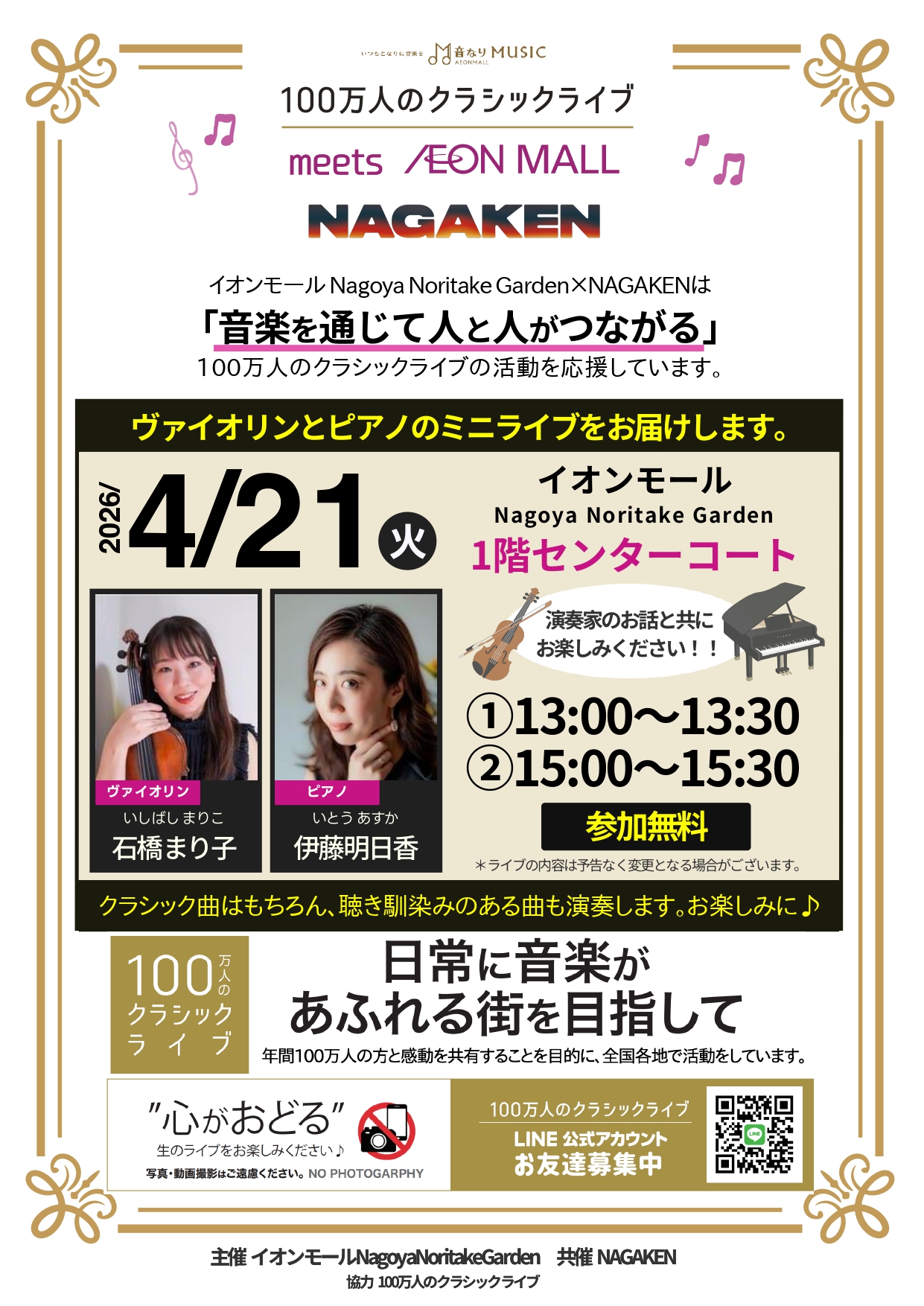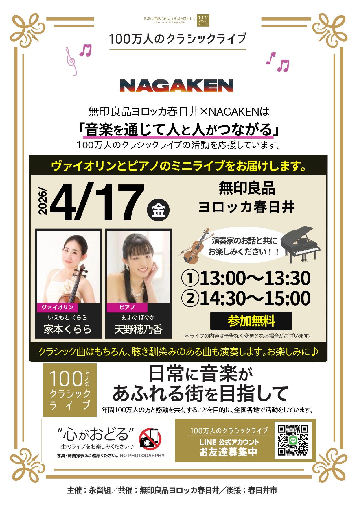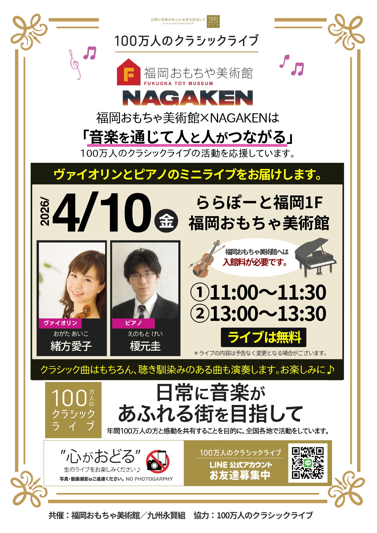 NAGAKENが開催する「100万人のクラシックライブ」4月の予定です。間近で生の演奏をお楽しみいただけます。皆様是非ご来場下さい。